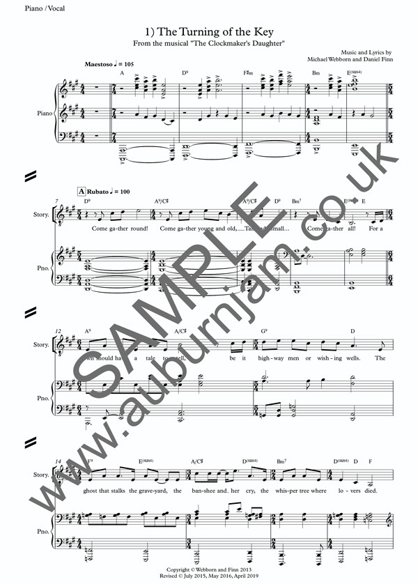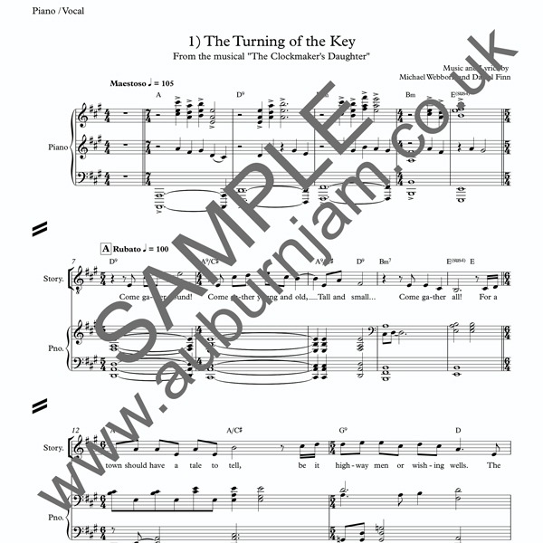 Buy PDF piano/vocal sheet music for “The Turning of the Key” from new musical The Clockmaker’s Daughter  by Webborn & Finn.